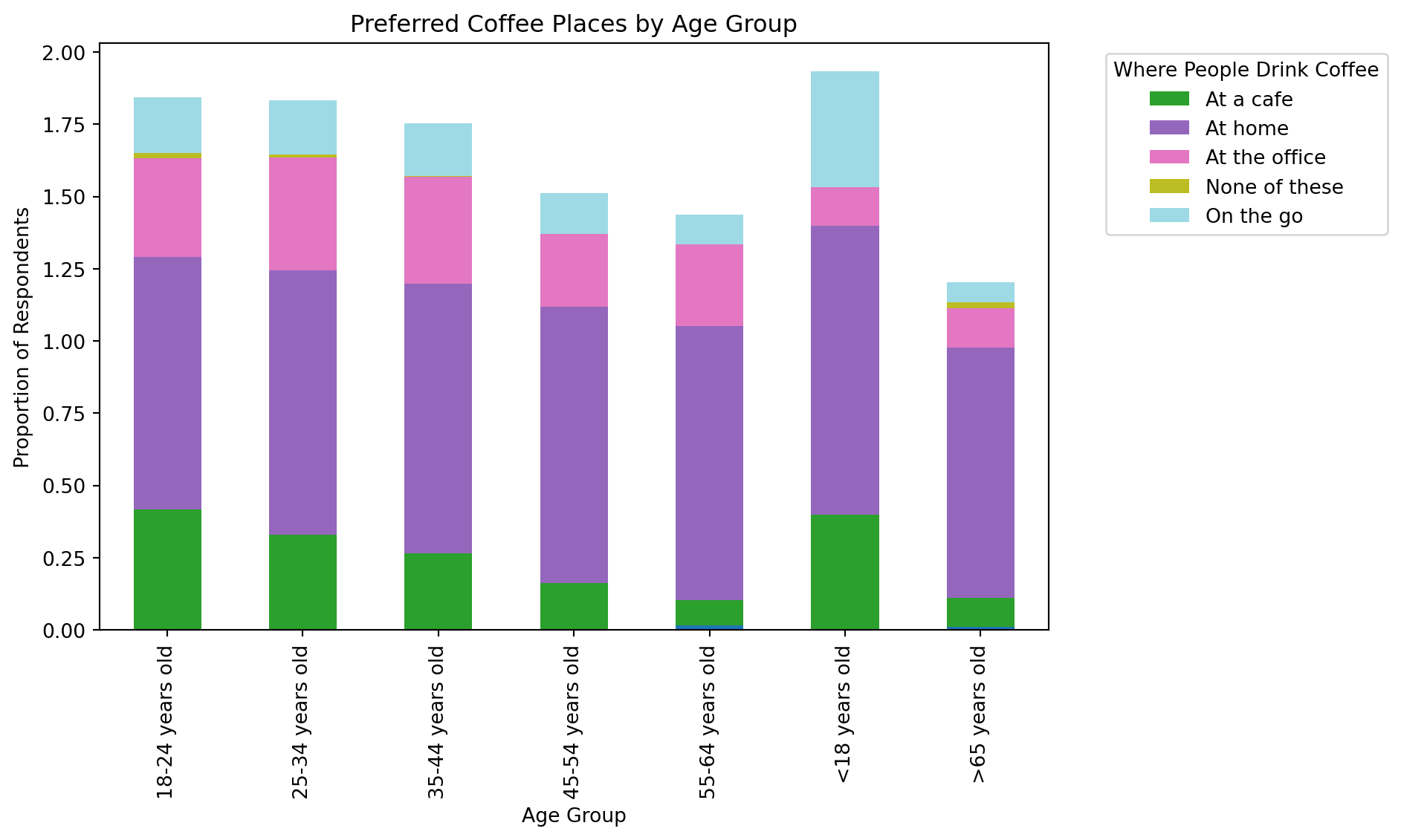 | 1 | >65 years old | At the office, At a cafe | Cortado | Fruity | [At the office, At a cafe] | 0 | 1 | 0 | 1 | 0 | 0 |