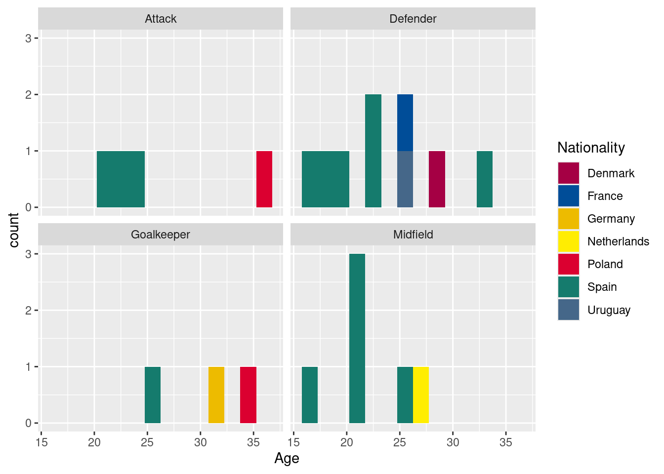 This is further shown in the figure below where for every position (except Goalkeeper) FC Barcelona has a young player (age below 25) coming from La Masia.