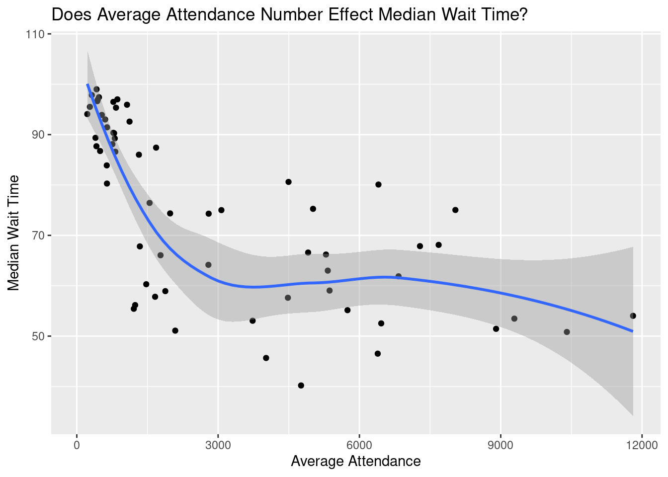 labs(title = "Does Average Attendance Number Effect Median Wait Time?",