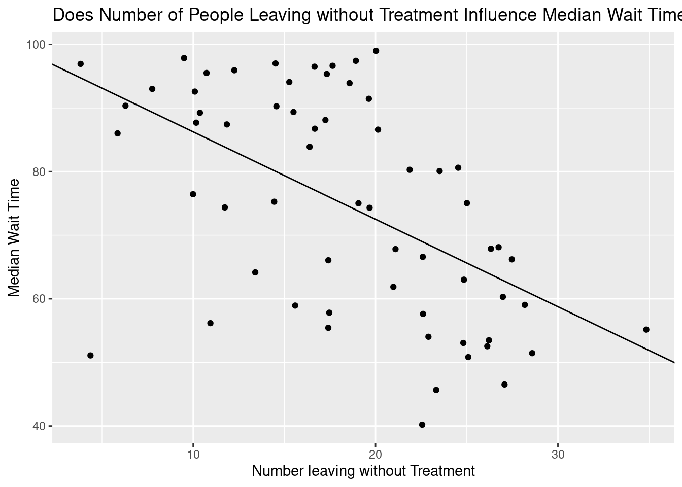 labs(title = "Does Number of People Leaving without Treatment Influence Median Wait Time?",