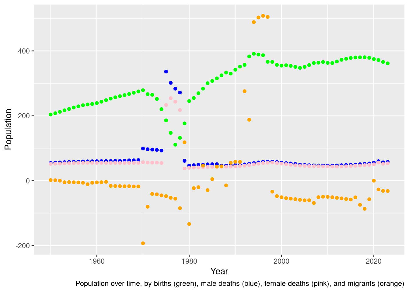 labs (caption = "Population over time, by births (green), male deaths (blue), female deaths (pink), and migrants (orange)", x = "Year", y = "Population")
