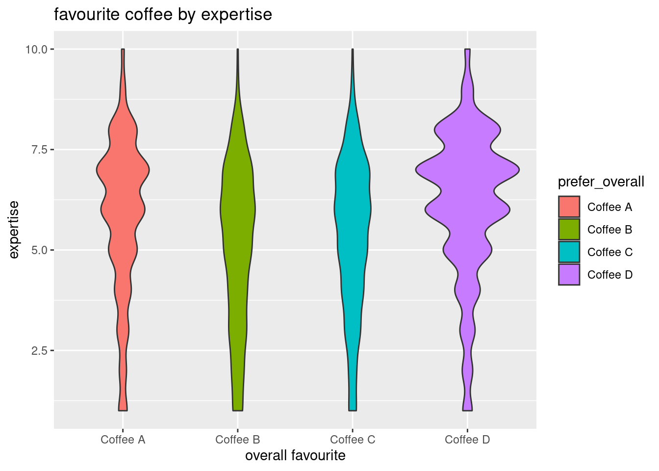 labs(x = "overall favourite", y = "expertise", title = "favourite coffee by expertise")