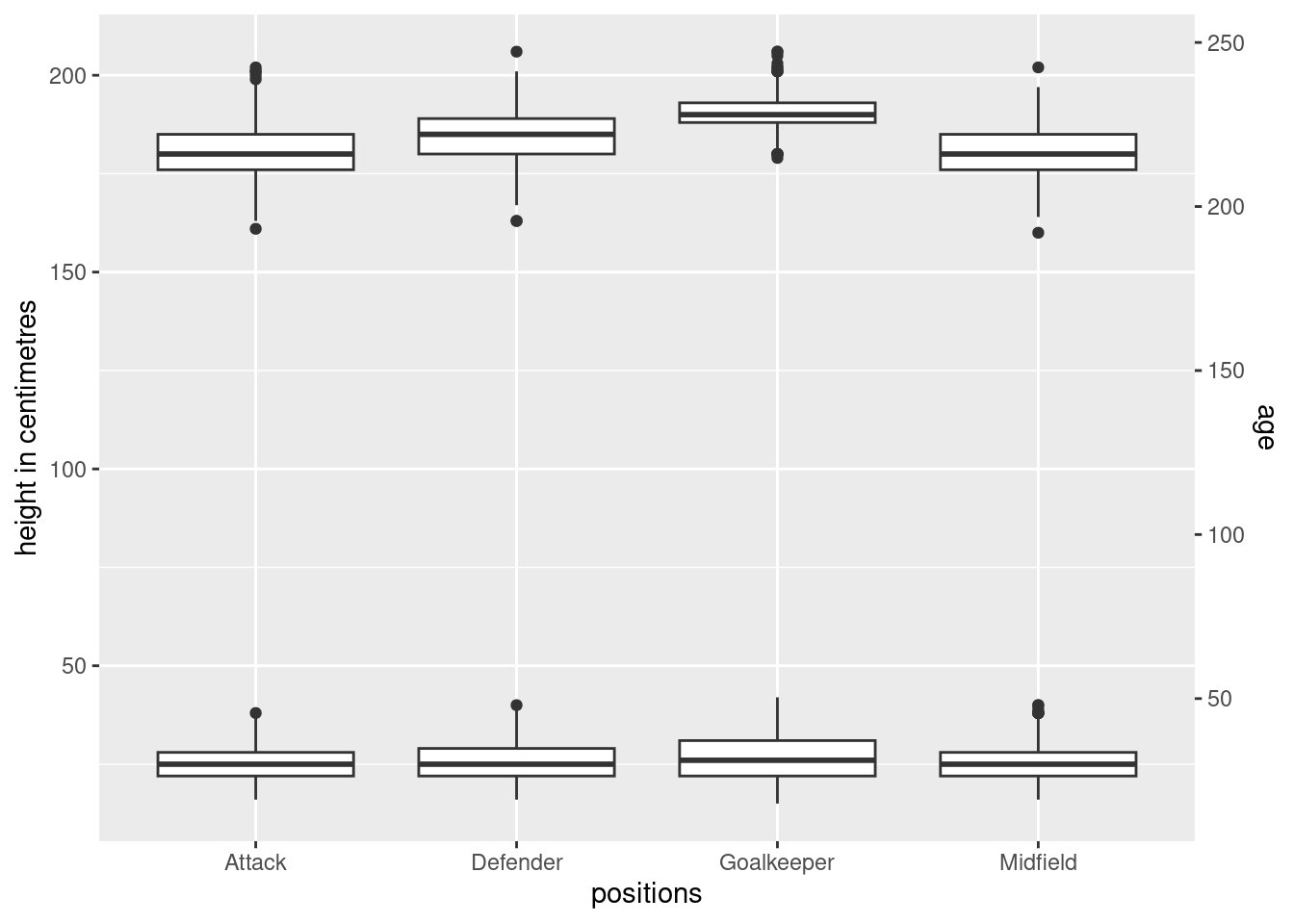 What if we just added the age in as another box plot (layered box plot). While this will tell us the distribution as well, it is rather unappealing and the box plots are squeezed as a result of the unnecessarily long scales.