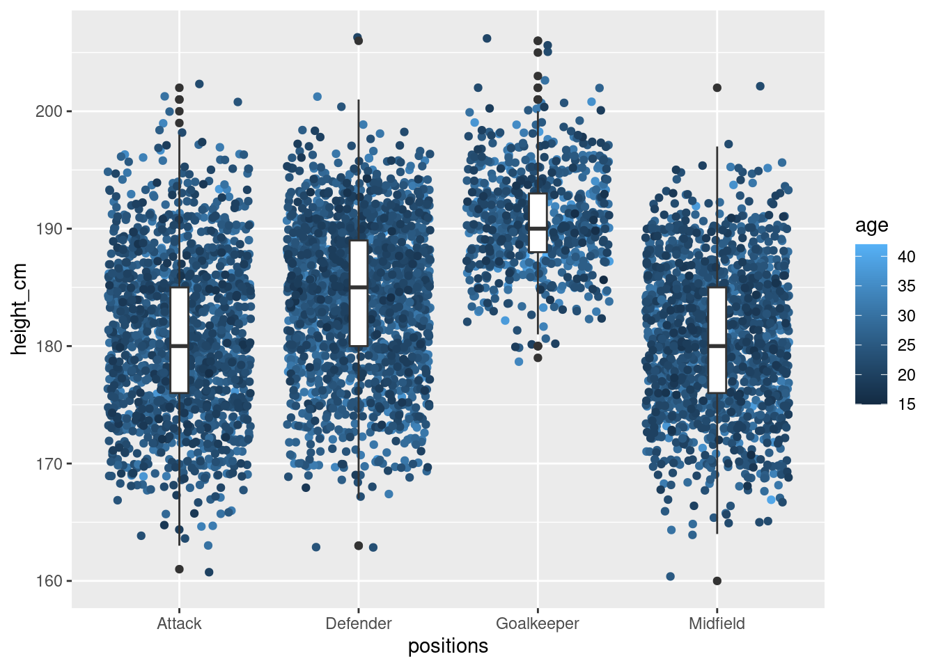 What if we added age points surrounding the box-plot to get the distribution of ages. It is rather messy because there is far too much (age) data for the same heights