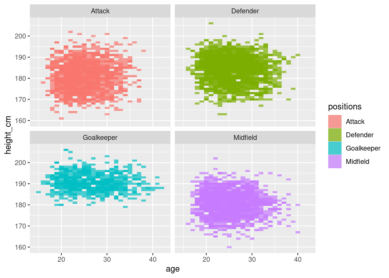 geom_tile(aes(fill=positions),alpha=0.5)Instead, we separate out the heatmaps into the individual positions. While this is more informative, the colours struggle to exactly show the distribution.