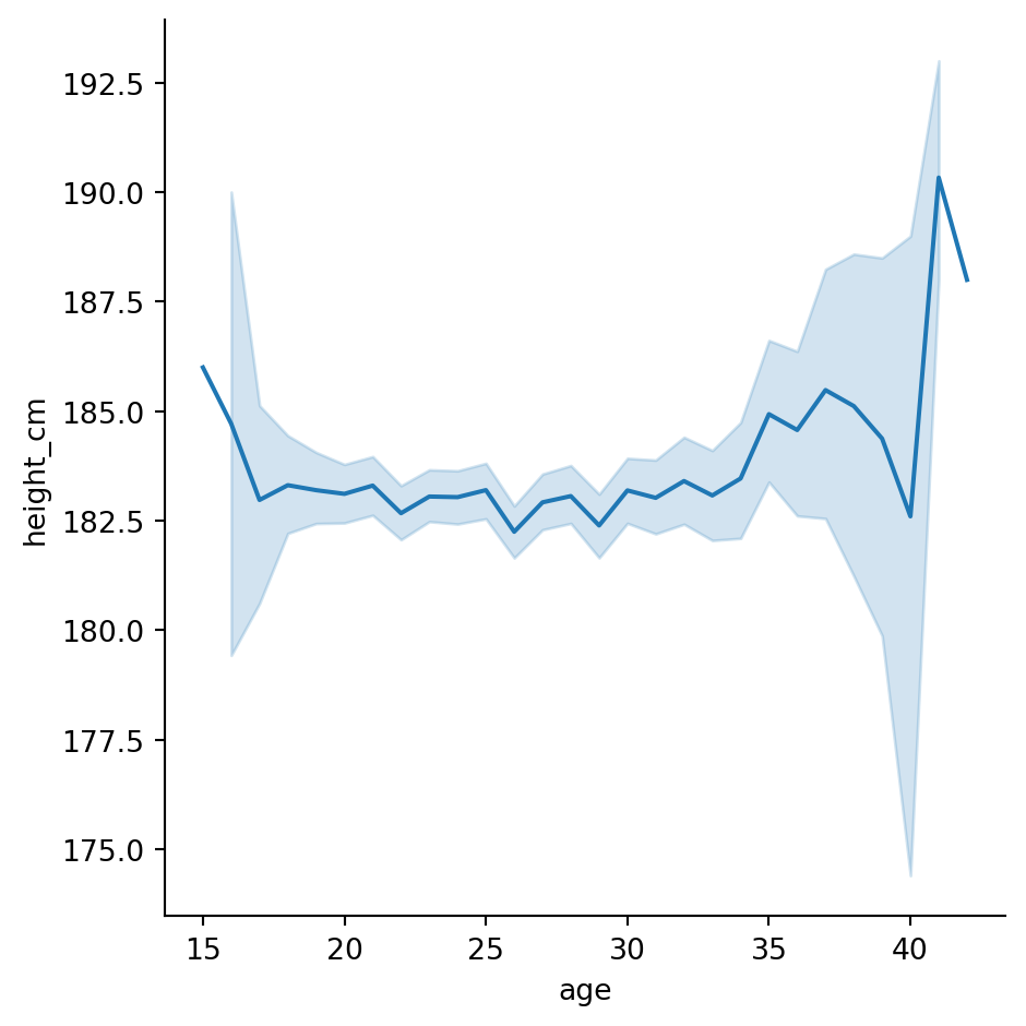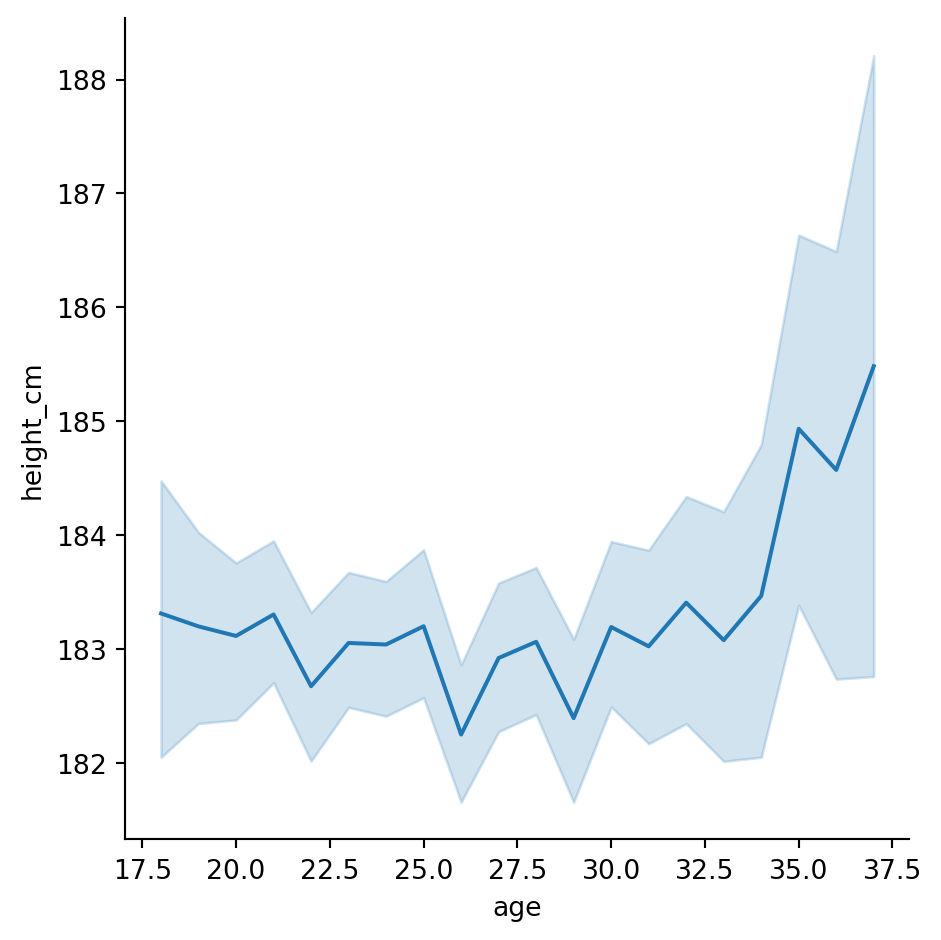 sns.relplot()etc. These just draw the points/bars/lines, and are normally behind-the-scenes. There’s one for every plot type, and look likesns.lineplot()sns.scatterplot()sns.boxplot()sns.histplot()- etc.