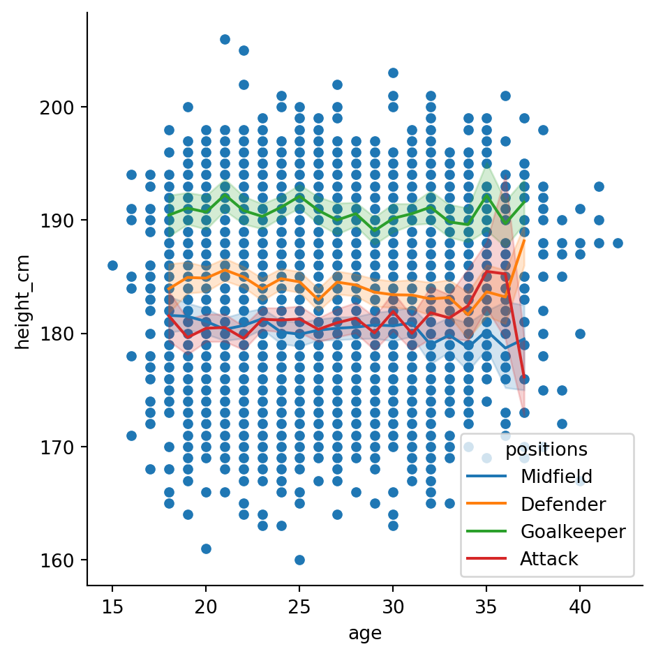px.scatter(data_frame = df, x = "age", y = "height_cm", color = "positions")And like seaborn’s “col”, we can facet with facet_col =