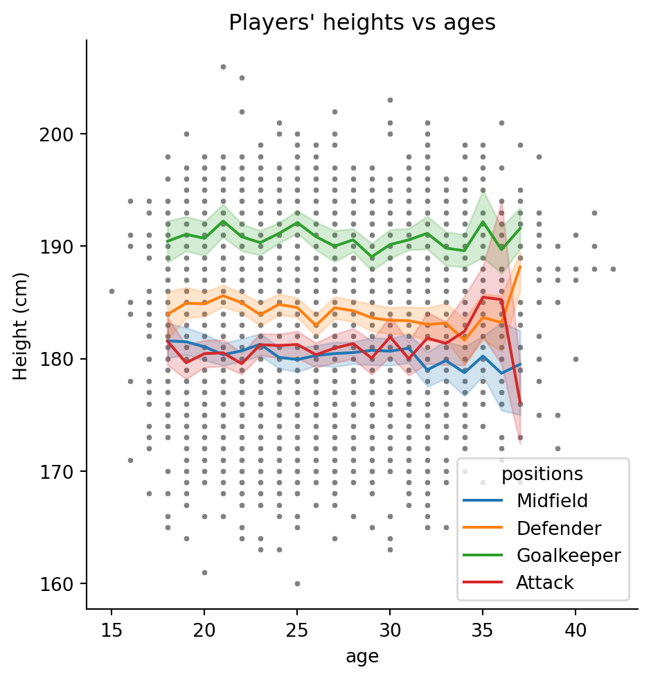 plt.title("Players' heights vs ages")Text(0.5, 1.0, "Players' heights vs ages")