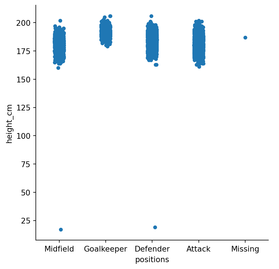 Let’s see if there’s a relationship between the players’ heights and positions, by placing their positions on the \(x\) axis and heights on the \(y\).