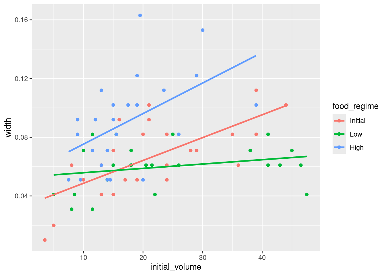 We can see that there are some relationships between the response variable (width) and our two covariates (food_regime and initial volume). But what about the interaction between the two covariates?