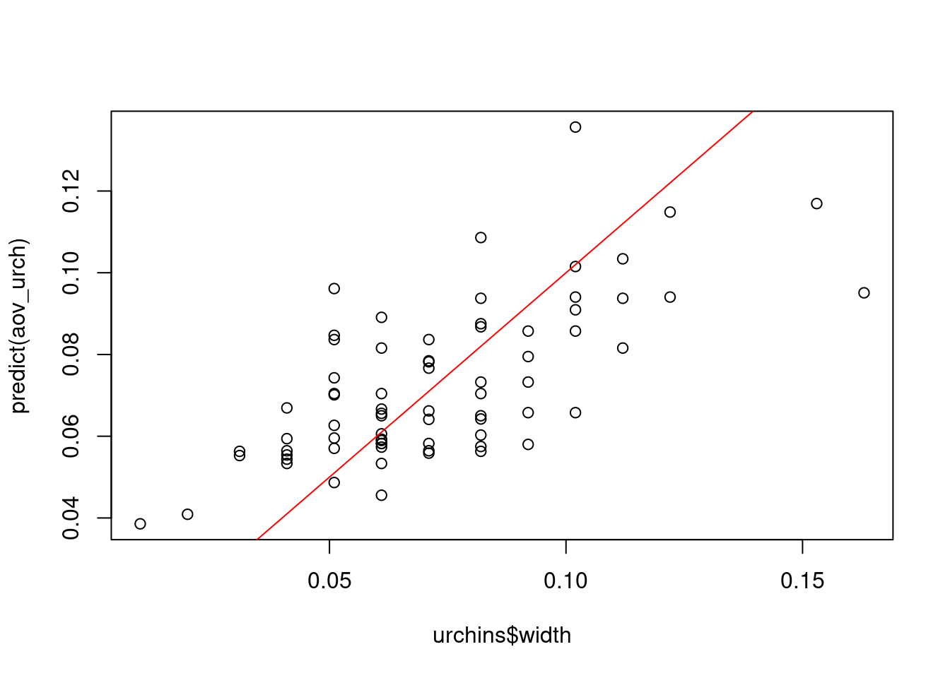 We can do an ANOVA with the aov() function to test for differences in sea urchin suture width between our groups. We are technically running and analysis of covariance (ANCOVA) as we have both a continuous and a categorical variable. ANOVAs are for categorical variables and we will see that some of the post-hoc tests are not amenable to continuous variables.